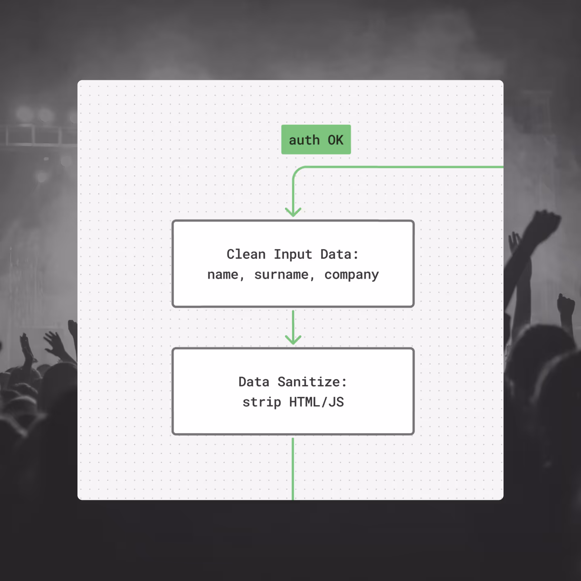 A secure backend proxy shields all API keys, tokens, and logic from the frontend, allowing safe access from any device with an internet connection. It handles all key scenarios: confirming check-in for registered guests, alerting when a guest is already checked in or missing from the list, and displaying error messages for connection or system issues.
