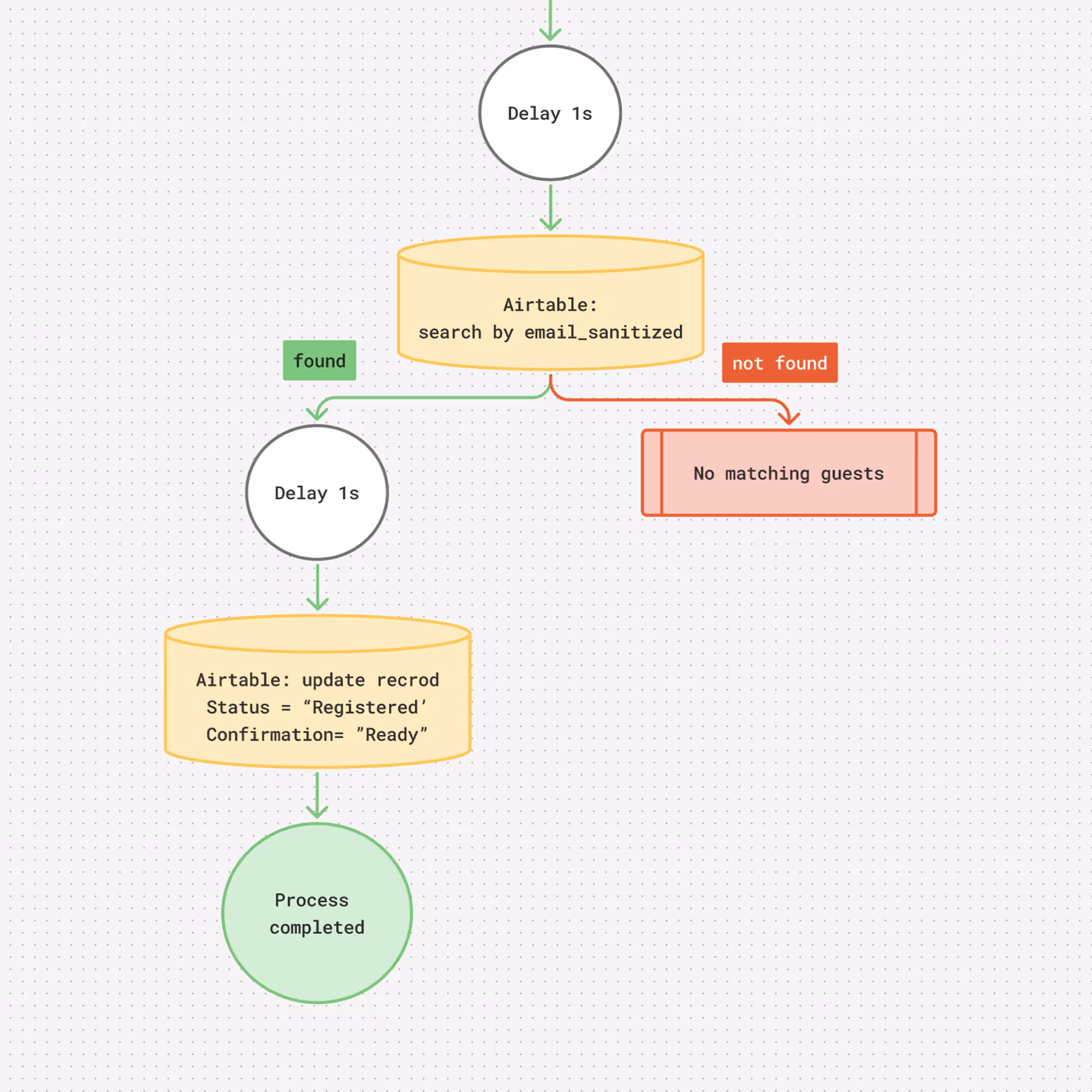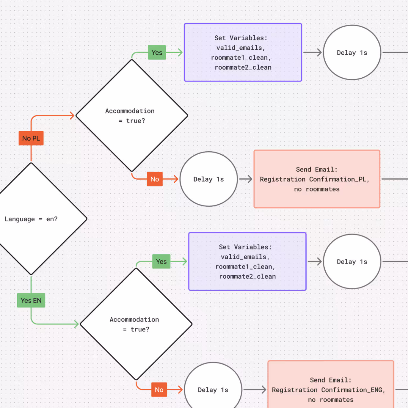 Matching a large number of guests into rooms can be chaotic. To simplify the process, I built with Airtable scripts a room-matching system, tested on over 1,700 guests. During registration, guests could provide the email addresses of up to two people they wanted to share a room with. The script automatically grouped correctly matched pairs and trios, while partially matched groups were reviewed manually. Finally, a drawing script randomly assigned the remaining unpaired guests to available rooms.